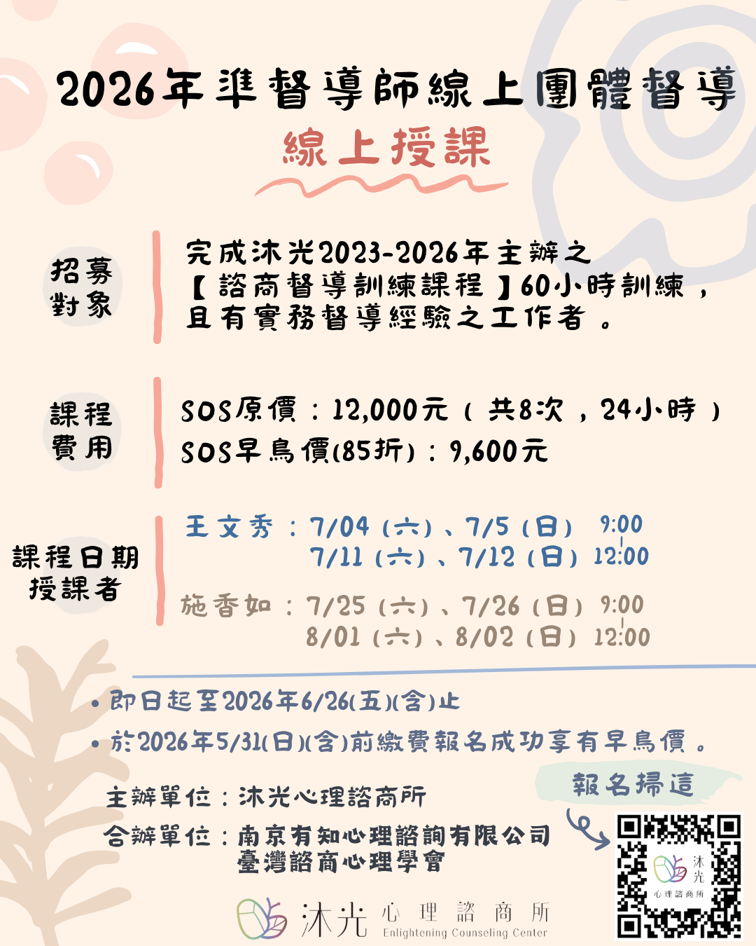 完成沐光2023-2026年主辦之【諮商督導訓練課程】60小時訓練,且有實務督導經驗之工作者。