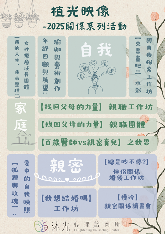 沐光誠摯的邀請您加入「自我」的關係系列活動,透過工作坊,反思、整理自己,並試著以更開放、更舒適的心態去面對與自處
