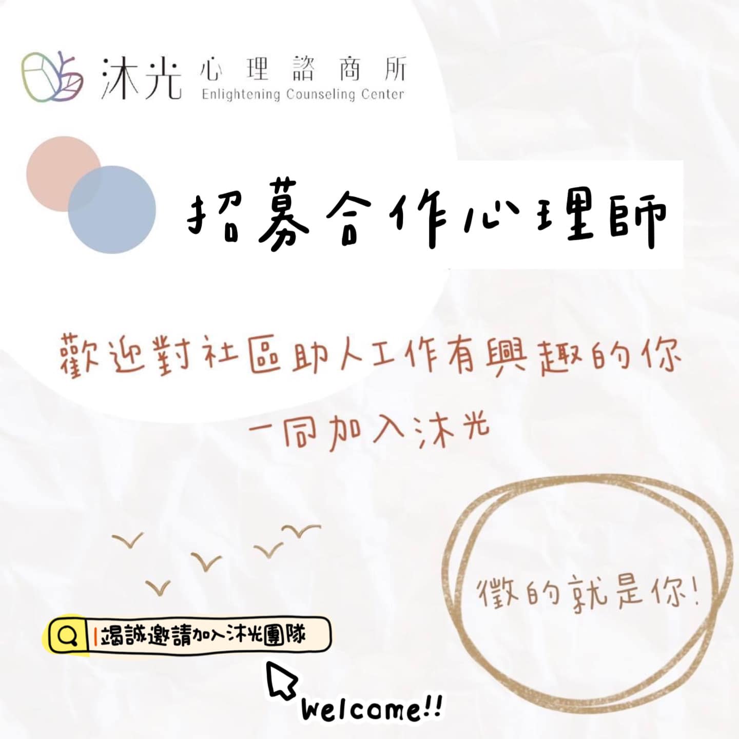 大家好,沐光心理諮商所徵求新夥伴的加入!