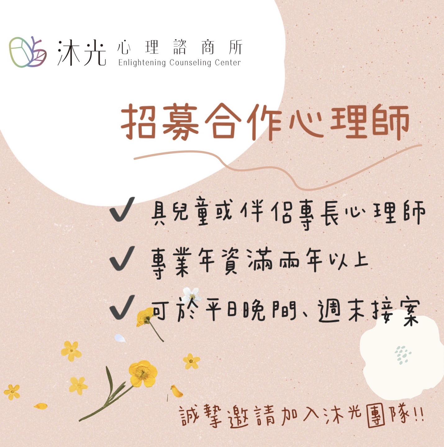 沐光心理諮商所徵求新夥伴的加入!