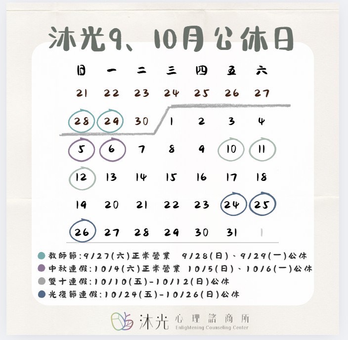 沐光心理諮商所公休時間