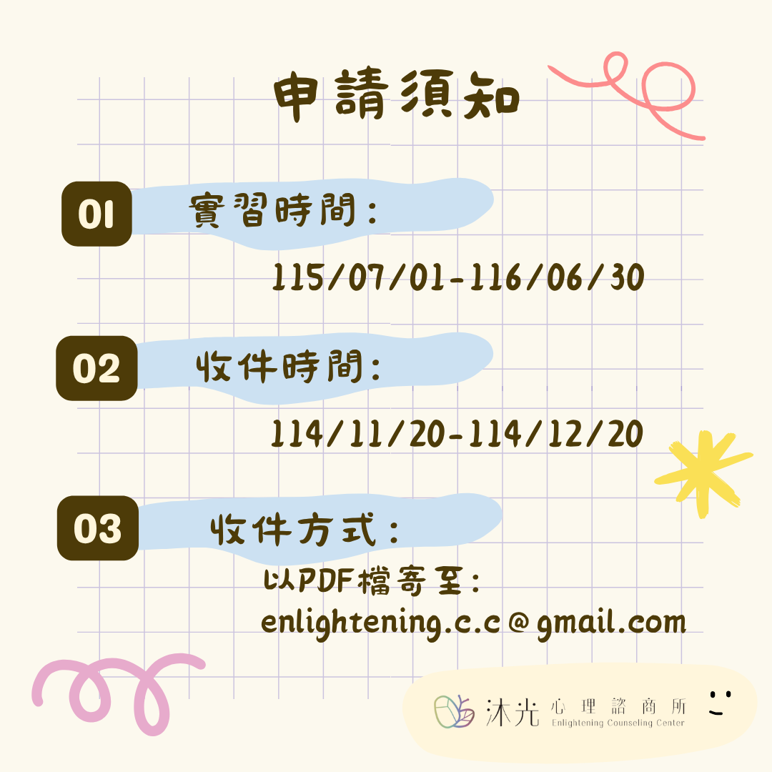 - 收件時間:訂於114/11/20至114/12/20(視實習機構審查結果調整),以電子郵件寄件日為憑,逾時恕不受理。