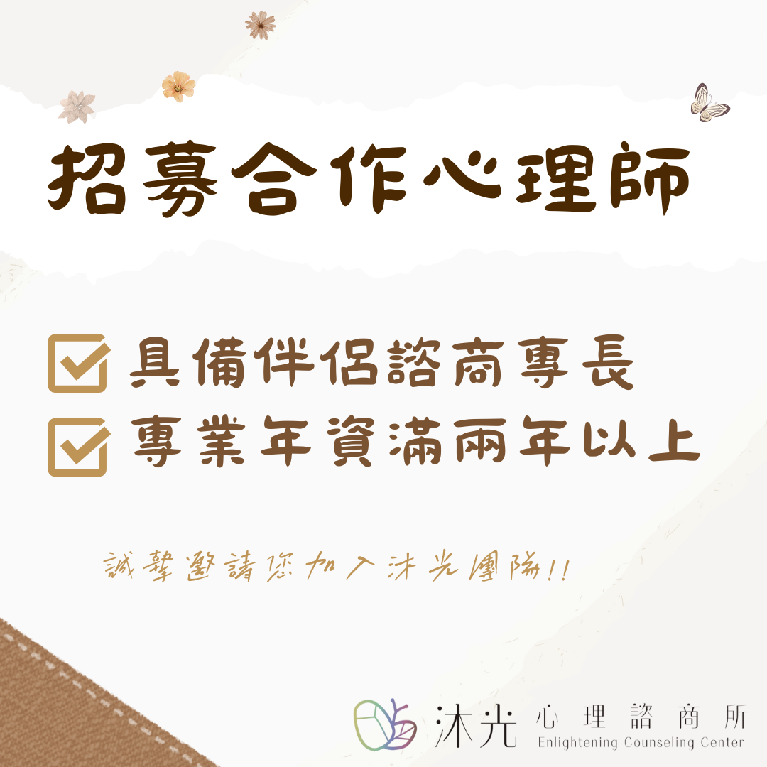 近期我們有感伴侶諮商的需求增加,為了能服務更多民眾,我們誠摯招募有此專長的心理師,加入沐光的團隊!