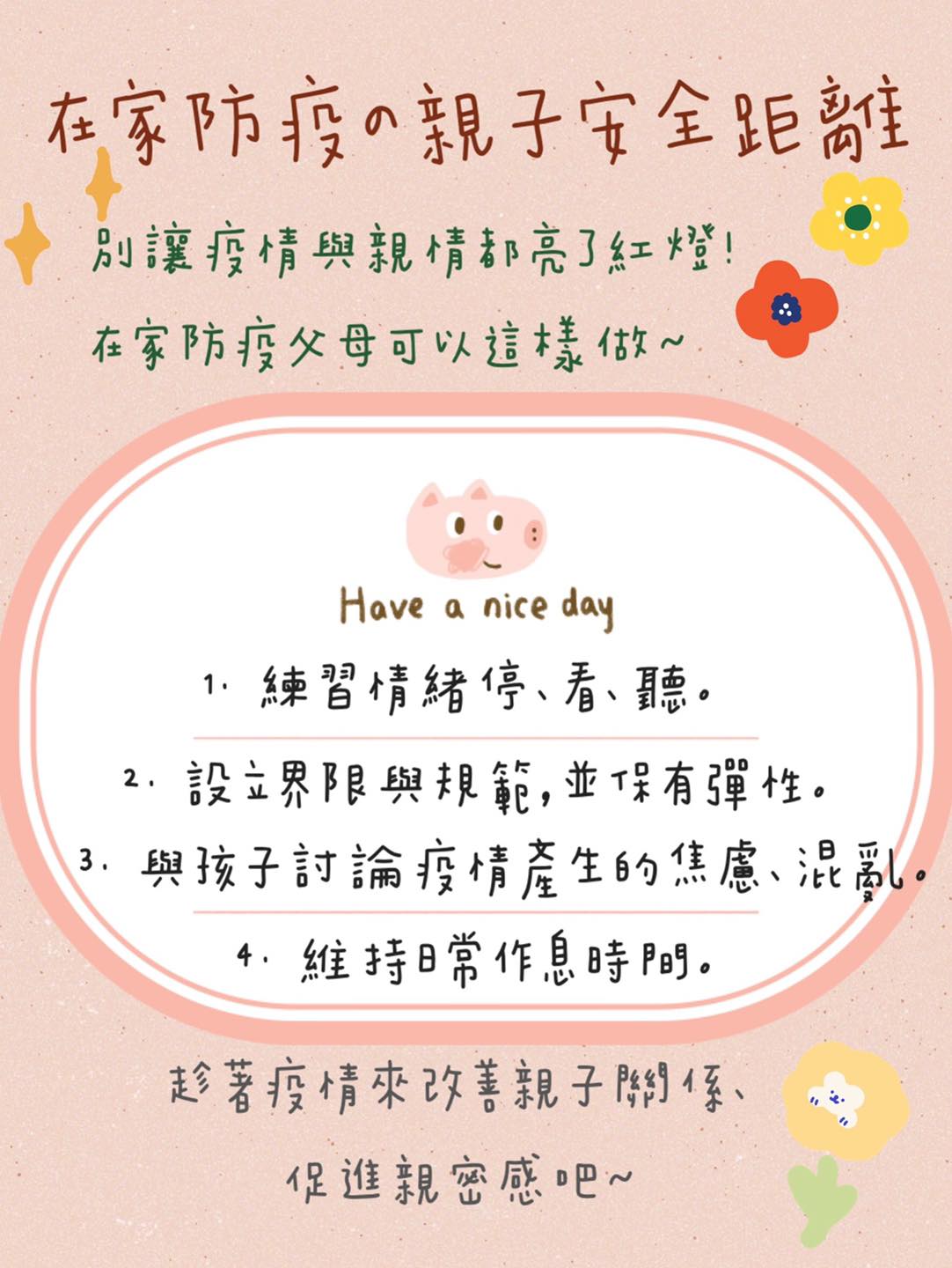 撰文/李姿瑩 諮商心理師本週開始為避免疫情擴散,宣布全國學校、 幼稚園、托嬰中心、補習班等皆停課兩週。相信對很多父母而言是一個憂喜交加的訊息, 雖可不必擔心孩子暴露在群聚感染的危險中, 但卻似乎在提前經歷寒暑假到來的晴天霹靂!面對突如其來的防疫假, 想和孩子保持安全又平和的親子關係, 父母可以這樣做~