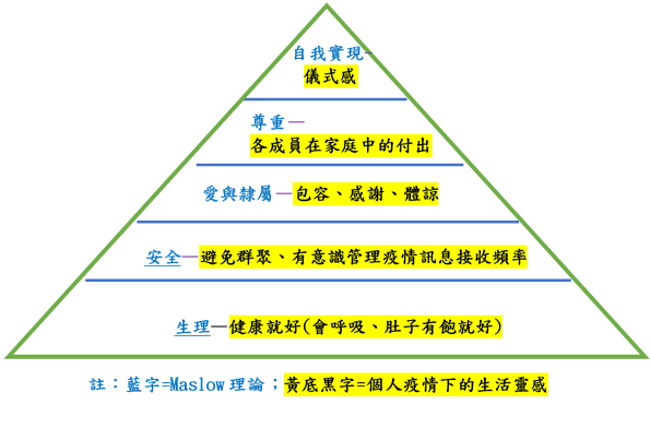 心理學家Maslow對人類的需求從生理層面的生存到心理層面的自我實現有一個經典的理論,此理論成為我在疫情生活下安頓自己身心、將有限心力做最適切分配的心靈地圖。
